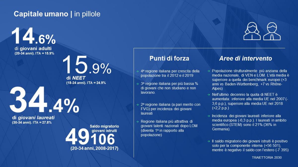 - Regione italiana più attrattiva per i giovani laureati dopo la Lombardia (+56.501 giovani tra il 2007 e il 2018).
