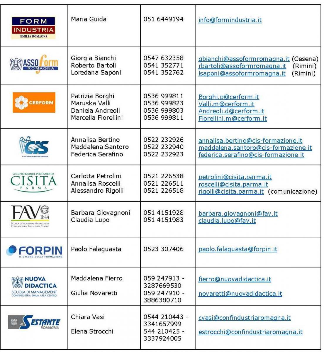 Il programma è promosso con il finanziamento dell’Unione europea-FSE e della Regione Emilia-Romagna. Tutte le attività sono state realizzate con il coordinamento di Formindustria Emilia-Romagna dai centri formativi di riferimento del sistema regionale Confindustria: Assoform Romagna, Cerform, Cis Scuola per la gestione d’impresa, Cisita Parma, Fondazione Aldini Valeriani, Forpin, Nuova Didactica e Il Sestante Romagna.